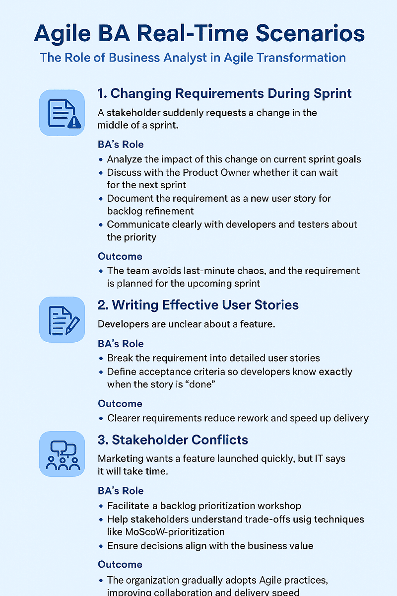 Agile BA real-time scenarios show how critical the role of Business Analysts is in today’s Agile projects. From handling changing requirements to facilitating stakeholder collaboration, BAs ensure that Agile teams deliver value consistently. More importantly, during an Agile Transformation, Business Analysts act as change leaders who guide organizations towards agility.