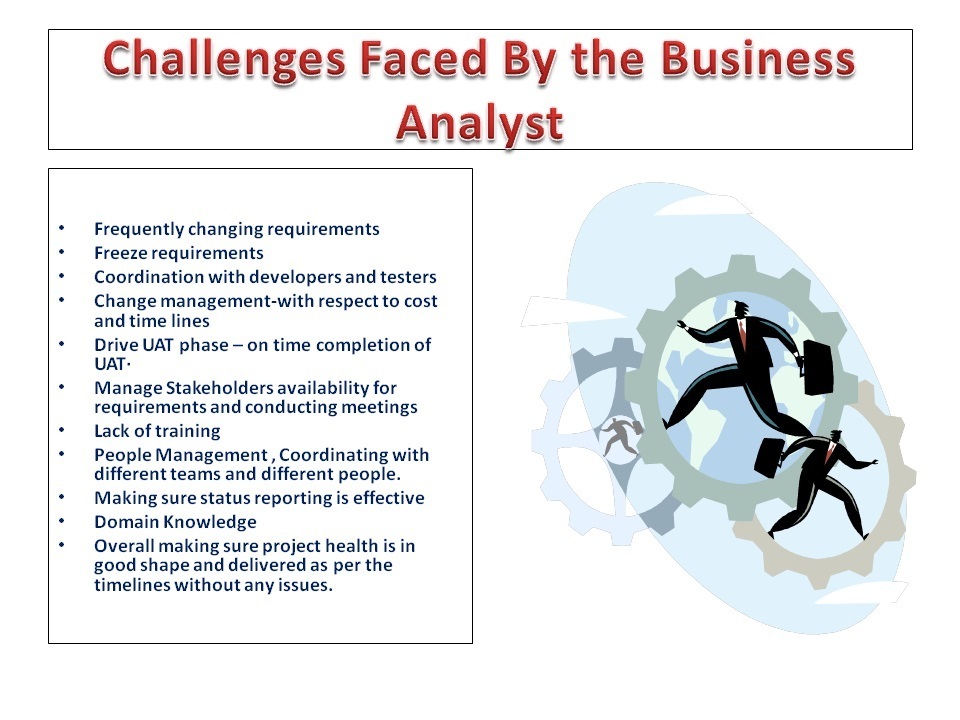 Here I am listing down the real time challenges faced by the Business Analyst. There can be other challenges but here I am mentioning few which are facing by the Business Analyst in day to day life. I believe it may enough when you are trying a fresher, one or two experience.